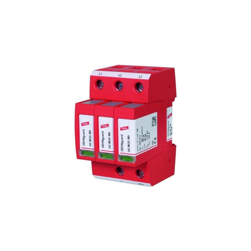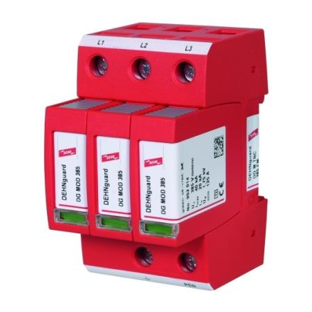DEHNGUARD M TNC 385 PARASURTENSION MODULAIRE TRIPOLAIRE POUR RESEAUX TNC. PROTECTION DU TYPE 2 SELON EN61643-11. COURANT D'ECOULEMENT NOM 20KA(8/20). NIVEAU DE PROTECTION < 1,35KV. TELESIGNALISATION PAR CONTACT INVERSEUR LIBRE DE POTENTIEL.