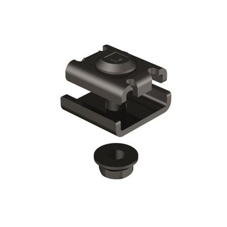 ACCOUPLEMENT RENFORCE 61, REVETEMENT BLACK C8. UN ACCOUPLEMENT UNIVERSEL POUR LES TREILLIS. COMPOSE DE 3 PIECES. UN BOULON M6 X 22,5 AVEC UNE TETE ADAPTE AUX FILS, UNE PLAQUE D'ACCOUPLEMENT 62 ET UN ECROU SIX PANS AVEC EMBASE CRENTEE M6.