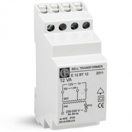 Marque: EREARéférence: E 12BT12Description: 1ph Transfo de securite - sonnerie 2 mod - 0-230V 0-8-24V - P 12VAEmballage: 4