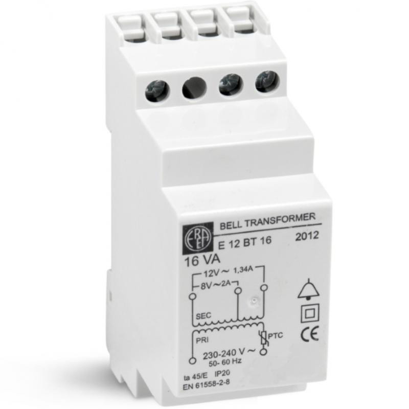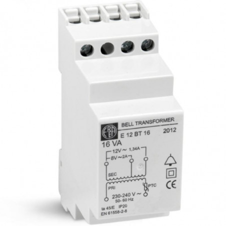 Marque: EREARéférence: E 12BT16Description: 1ph Transfo de securite - sonnerie 2 mod - 0-230V 0-8-24V - P 16VAEmballage: 4