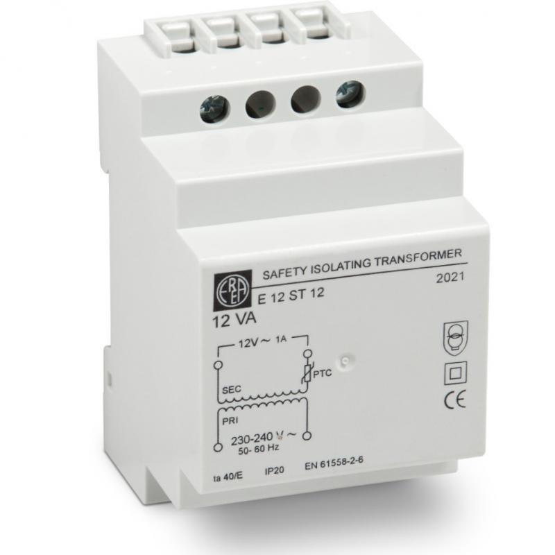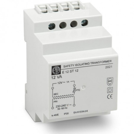 Marque: EREARéférence: E 12ST12Description: 1ph Transfo de securite modulaire 3 mod - 0-230V 0-12V - P 12VAEmballage: 4