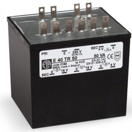 Marque: EREARéférence: E 40TR50Description: 1ph Transfo de protection - 230V 0-16-20-24-28-33-36-40V P 50VAEmballage: 1