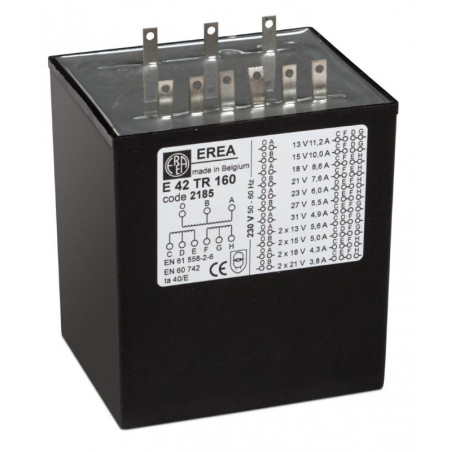 Marque: EREARéférence: E 42TR160Description: 1ph Transfo de protection - 230V 0-13-15-18-21-23-27-31V P 160VAEmballage: 1