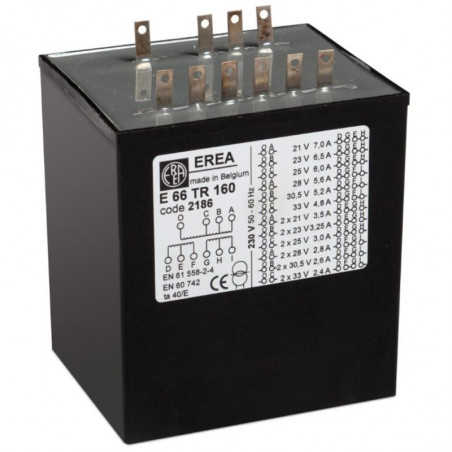 Marque: EREARéférence: E 66TR160Description: 1ph Transfo de protection - 230V 0-21-23-25-28-305-33V P 160VAEmballage: 1