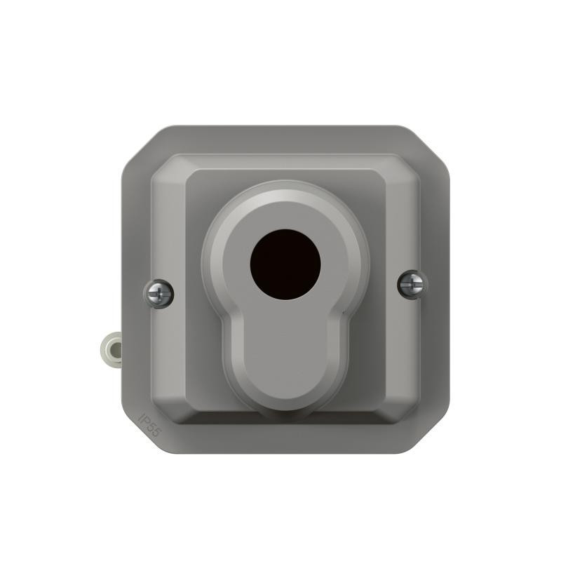 Description: PLEXO interrupteur a cle - 3 positions - 250V 3A - 2 contacts NO 3A marquage I-0-II - Ronis n 455 - livre avec cle - livre sans boite de montage en surface ou cadre encastre - IP55 IK06 - gris