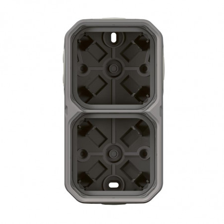 Description: Plexo boitier a embouts - 2 poste horizontaux ou verticaux - 3 entrees simple en 1 entree double - embouts a membrane - IP55 IK08 - gris