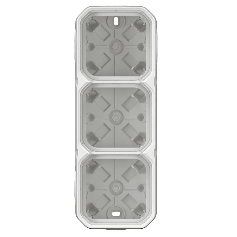 Description: Plexo boitier a embouts - 3 poste horizontaux ou verticaux - 4 entrees simple en 1 entree double - embouts a membrane - IP55 IK08 - blanc