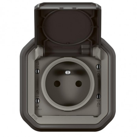 Description: Plexo prise de courant 16A - 250V - bornes automatiques - encastre - livre complet avec support plaques IP55 - IK08 - anthracite