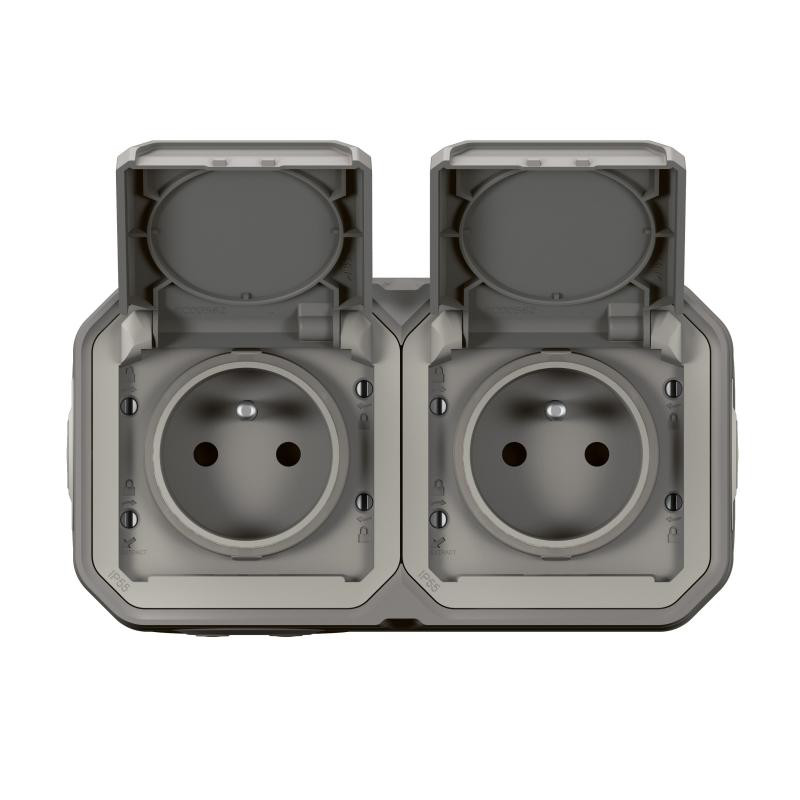 Description: Plexo GP double prise de courant a volet - precablee horizontale - appareil complet avec boite IP55 - gris