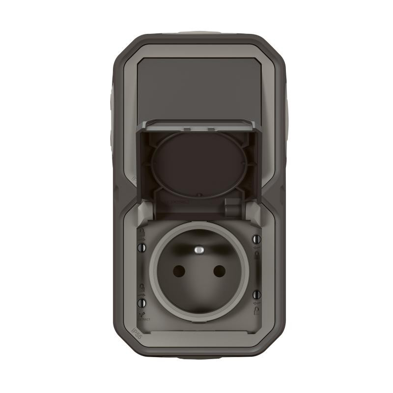 Description: Plexo GP inter 2 directions prise de courant 2PT a volet - verticale - appareil complet avec boite IP55 - anthracite