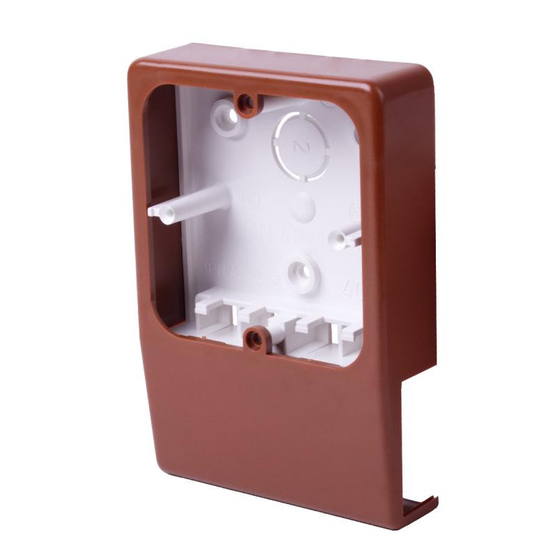 BOITE D'APPAREILLAGE, EN MATIERE SYNTHETIQUE IMITATION CHENE FONCE, POUR INSTALLER UN MECANISME AVEC ANNEAU AU-DESSUS LA GAINE D'ALIMENTATION LHD 40X20. UN ADAPTATEUR POUR MONTER AU-DESSUS LA GAINE ET LE MECANISME.
