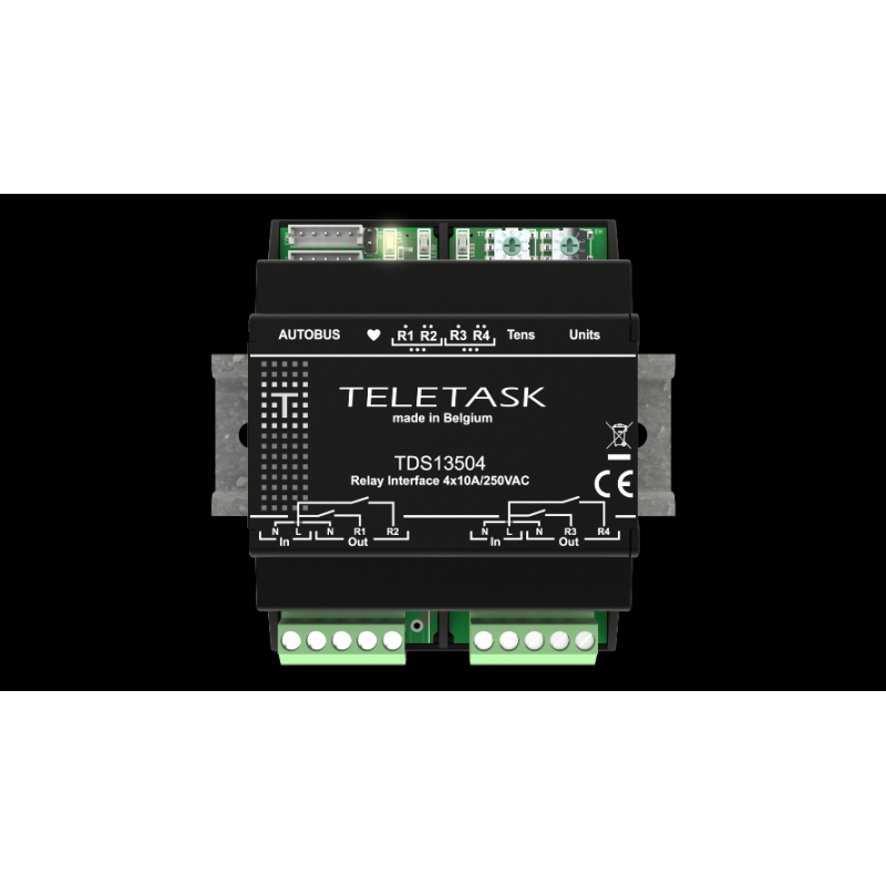 INTERFACE DE RELAIS AVEC 4 SORTIES A CONTACT 10A/250V POUR COMMUTATION GENERALE MARCHE/ARRET ET COMMANDE PAR IMPULSION.CONTACT NORMALEMENT OUVERT (NO) LORSQU'IL N'EST PAS ALIMENTE PAR L'AUTOBUS.DIMENSIONS: 72L X 90H X 61P (MM) - DIN 4TE