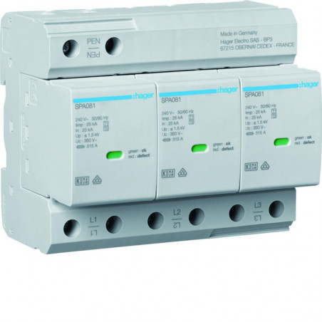 Description: Parafoudre 3P débrochable 75kA (TNC) type 1 + 2 avec indicateur de réserve et télésignalisation