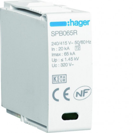 Marque: HagerRéférence: SPB065REAN: 3250615515377Emballage: 1Description: Cartouche phase 65kA pour SPB265R et SPB465R