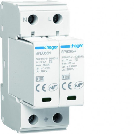 Marque: HagerRéférence: SPB265REAN: 3250615515490Emballage: 1Description: Parafoudre 65kA 2P avec indicateur de réserve et télésignalisation