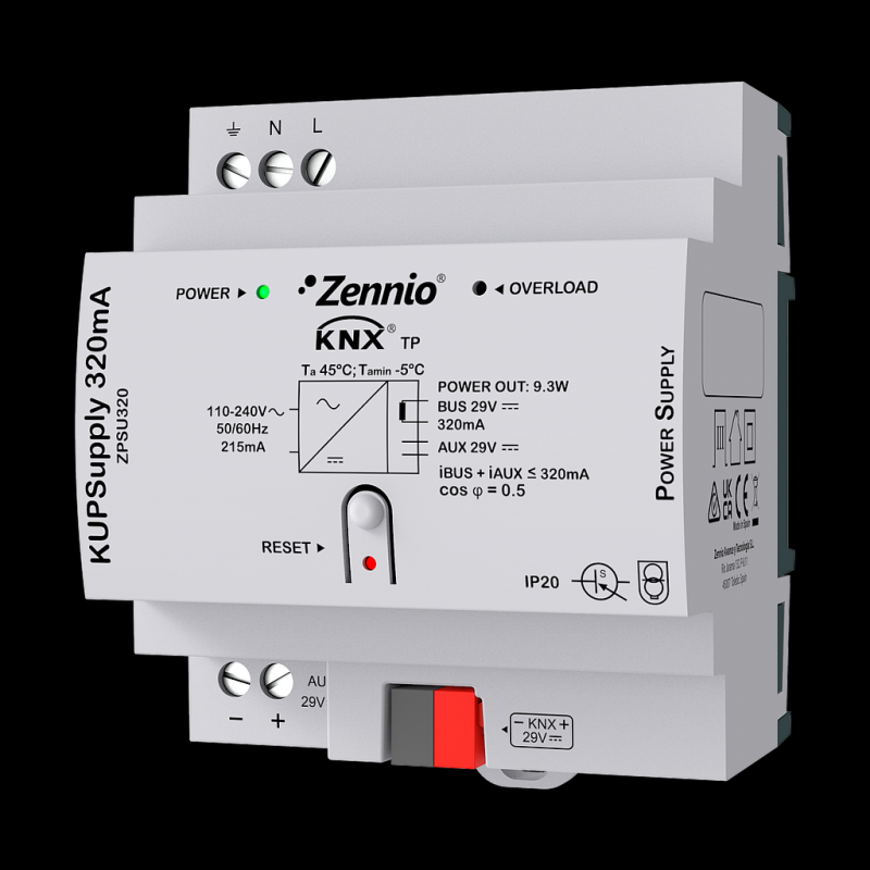 Description: Sortie supplémentaire de 29VDC Courant maximum (bus + aux.) = 320mA max.Bouton poussoir pour réinitialiser la ligne KNX sur l'appareilProtégé contre les courts-circuits et les surcharges.Tension d'entrée : 230VACRail DIN 4,5 modules