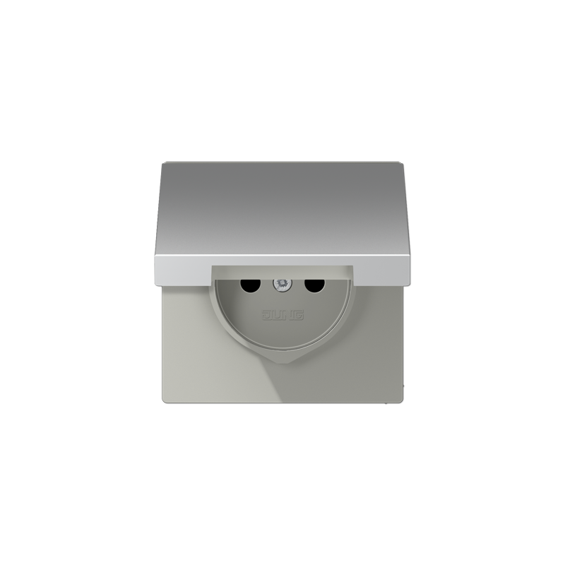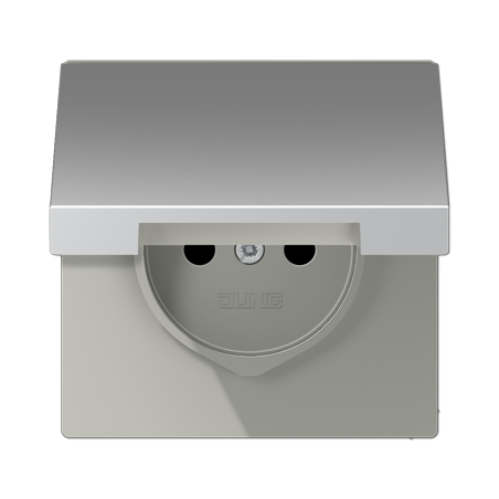 ENJOLIVEUR POUR PRISE AVEC COUVERCLE A CHARNIERE AVEC RESSORT DE RAPPELPOUR MECANISME PRISE, SYSTEME FRANCAIS ET BELGE, ART. N. 1520 ..F EINS, 1521 ..F EINSAVEC OBTURATEURS SAFETY PLUSMATERIAU THERMOPLASTIQUE LAQUECOULEUR ALUMINIUM