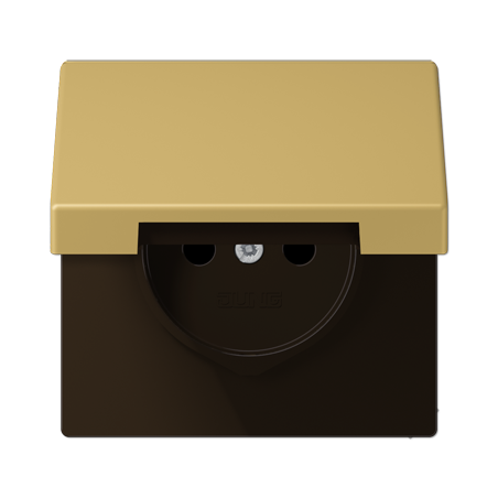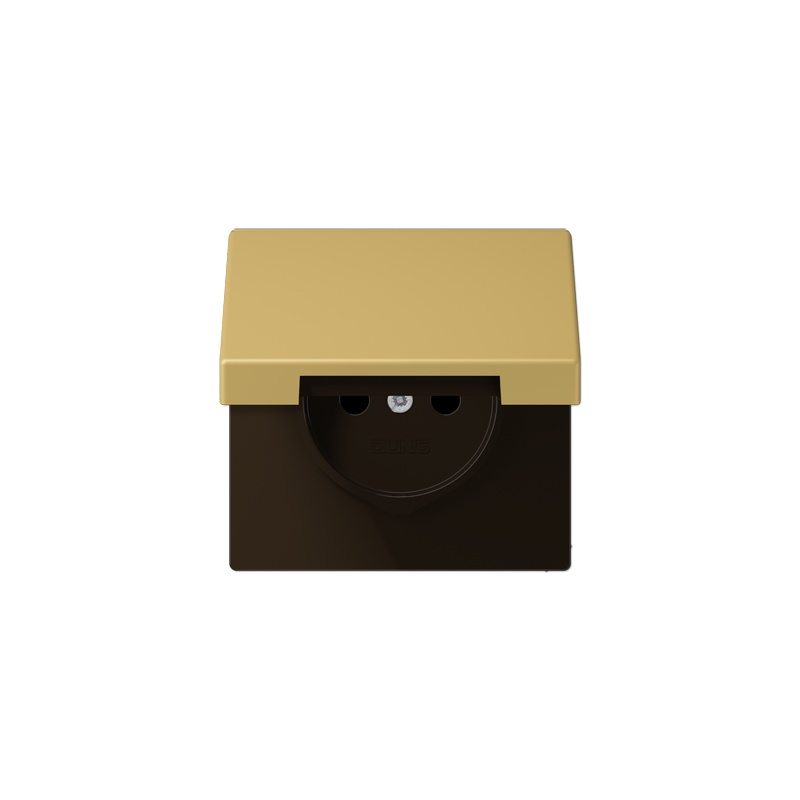 ENJOLIVEUR POUR PRISE AVEC COUVERCLE A CHARNIERE AVEC RESSORT DE RAPPELPOUR MECANISME PRISE, SYSTEME FRANCAIS ET BELGE, ART. N. 1520 ..F EINS, 1521 ..F EINSAVEC OBTURATEURS SAFETY PLUSMATERIAU THERMOPLASTIQUE LAQUECOULEUR LAITON DORE