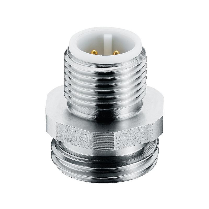 Connecteur droit à encastrer M12 à 5 pôles mâles, raccordement vissé blindé, M16 x 1,5, adapté à 60V/4A, IP 67, boîtier en acier inoxydable, -25 à +70 °C. La vis pour le côté du panneau est la RSKFM 16 (art. n° 900025049).