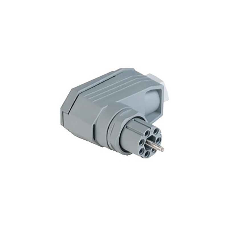 Connecteur rond femelle 6+PE coudé avec vis moletée, avec connexion à pince et douille à ressort, 7 à 9 mm (PG 11), adapté à 250 V AC/DC 10 A, -40 à 90 °C, IP 65. Selon la norme DIN EN 175201-804 type FF