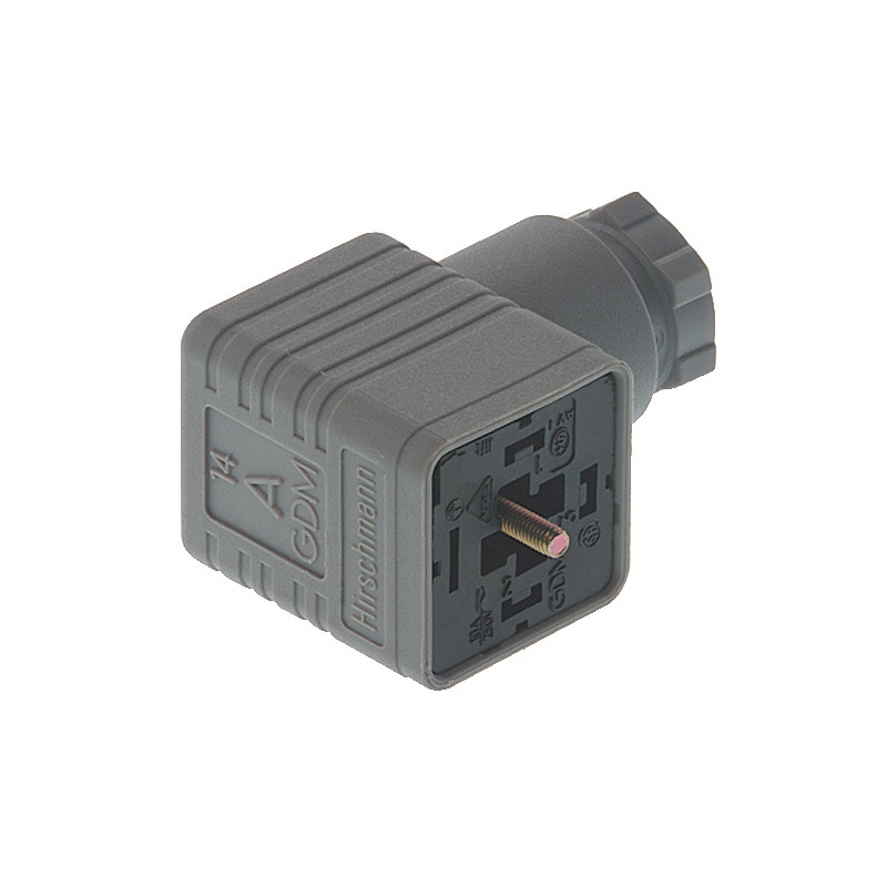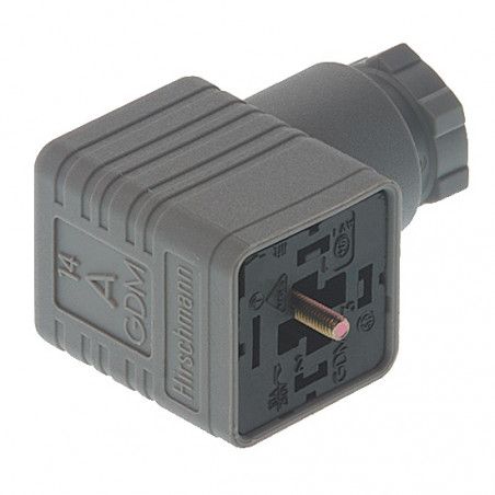 Connecteur de vanne femelle 3+PE coudé gris de type A, vis centrale M3x35, 6-9mm/0,25 - 1,5mm² ; PG11, 250 V/16 A, -40 à 125 °C, IP 65. Norme DIN EN 175 301-803-A