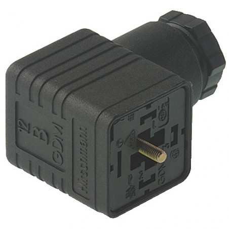 Connecteur de vanne femelle 2+PE coudé noir de type A, vis centrale M3x35, 6 - 9mm/0,25 - 1,5mm² ; PG11, 250 V/16 A, -40 à 125 °C, IP 65. Norme DIN EN 175 301-803-A
