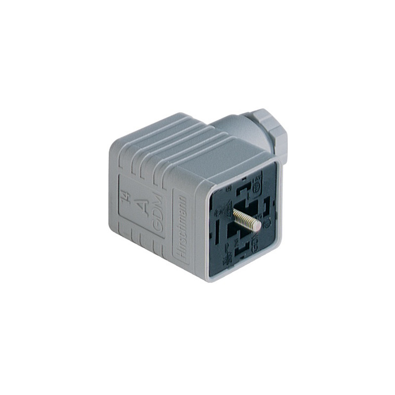 Connecteur de vanne femelle 2+PE coudé gris de type A, vis centrale M3x35, 4,5 - 7mm/0,25 - 1,5mm² ; PG9, 250 V/16 A, -40 à 125 °C, IP 65. Norme DIN EN 175 301-803-A