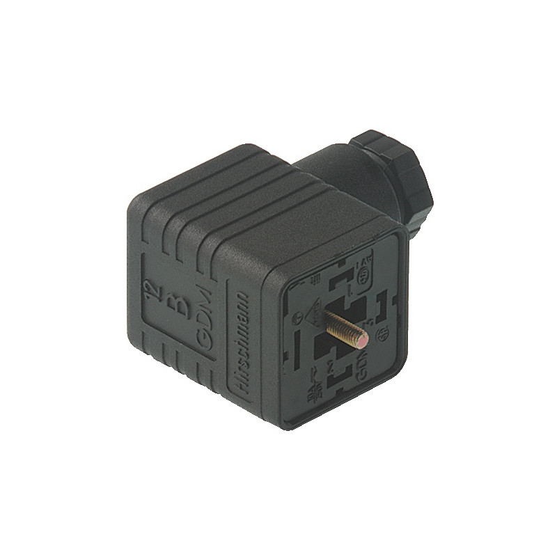 Connecteur de vanne femelle 3+PE coudé noir de type A, vis centrale M3x35, 4,5 - 7mm/0,25 - 1,5mm² ; PG9, 250 V/16 A, -40 à 125 °C, IP 65. Norme DIN EN 175 301-803-A