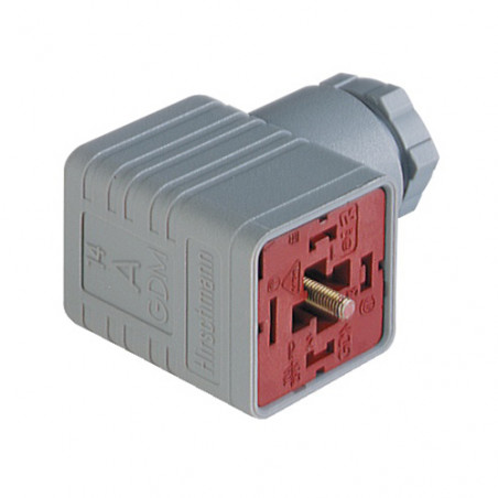 Connecteur de vanne femelle 3+PE coudé gris de type A, vis centrale M3x35, 6-9mm/0,25 - 1,5mm² ; PG11, 250 V/16 A, -40 à 125 °C, IP 65, UL. Norme DIN EN 175 301-803-A