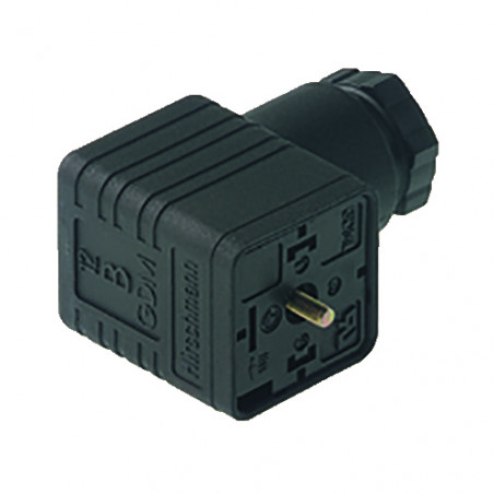 Connecteur de vanne femelle 2+PE coudé noir de type A avec pont redresseur - varistor, vis centrale M3x35, 4,5-11mm/0,25 - 1,5mm² ; PG11, 250 V/2 A AC/1 A DC, -40 à 90 °C, IP 65, UL. Norme DIN EN 175 301-803-A
