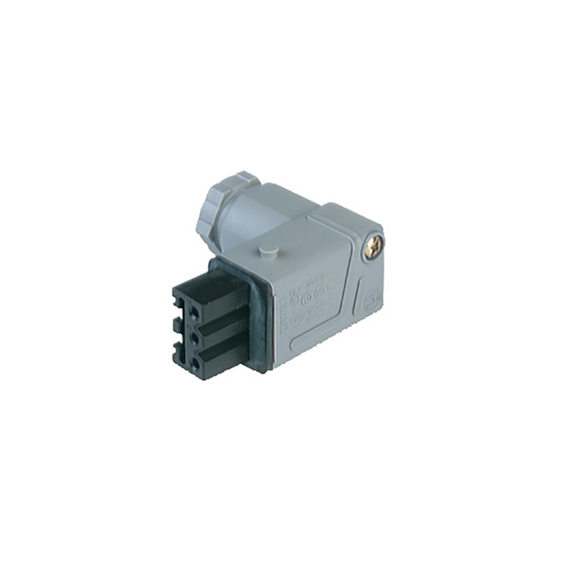 Connecteur femelle coudé gris avec décharge de traction, 3+PE, 6,0 - 10,0mm/max. 1,5mm² (PG11), 250 V DC/ 400 V AC;10 A DC/16 A AC, -30 à 90 °C, IP 54. Verrouillage possible avec STASI 3 (art. n° 732045001).