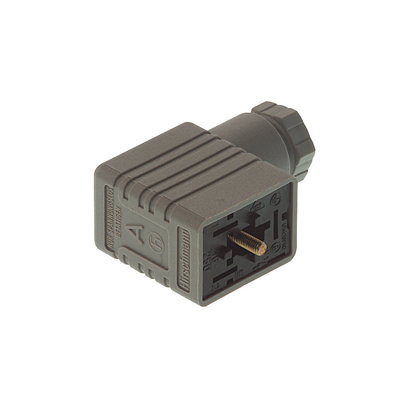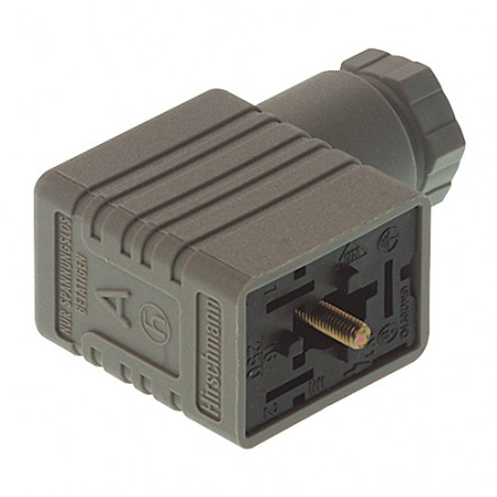 Connecteur de vanne femelle coudé gris 2+PE type B, vis centrale M3x35, 4,5 - 7mm/0,25 - 1,5mm² ; PG9, 250 V/16 A, -25 à 125 °C, IP 65. Norme de l'industrie