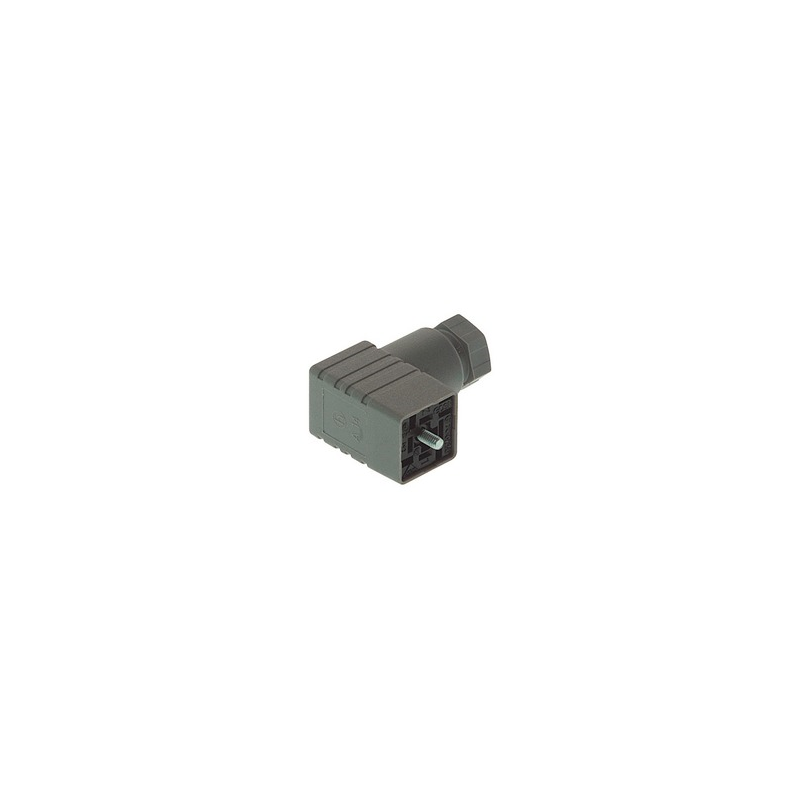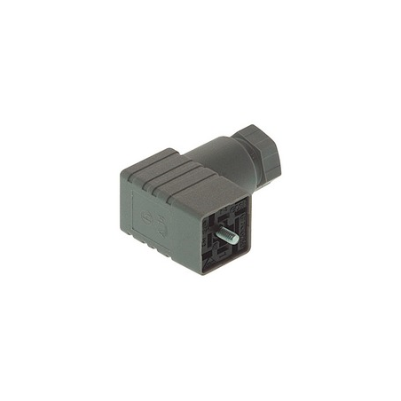 Connecteur de vanne femelle 3+PE coudé gris de type C, vis centrale M2,5x27, 4,5 - 6mm/max. 0,75mm² ; PG7, 250 V/6 A, -40 à 125 °C, IP 65. Norme DIN EN 175 301-803-C