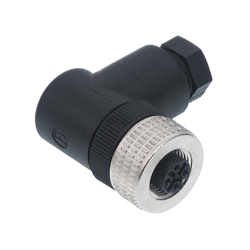Connecteur femelle M12 à 5 pôles coudé avec décharge de traction par pince à cage, 6,0 à 8,0 mm (PG9), convient pour 50V/4A, IP 67, boîtier plastique (PA), -25 à +90 °C.
