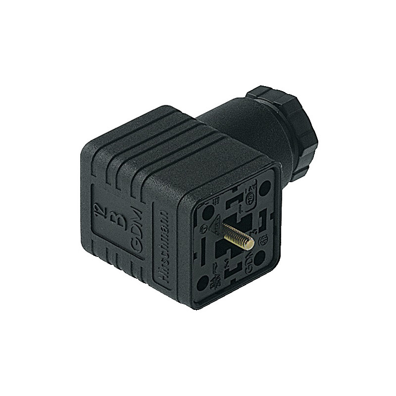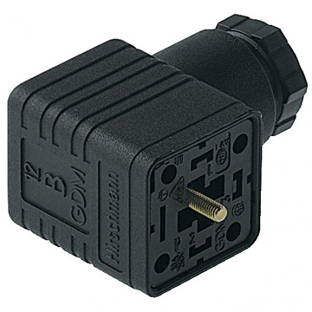 Connecteur de vanne femelle 2+PE/3+PE noire non montée de type A pour minuteries de puissance junior (JPT) sans contacts, vis centrale M3x35, 6-9mm/max. 2,5mm² ; PG11, 250 V/12 A, -40 à 125 °C, IP 65. Norme DIN EN 175 301-803-A