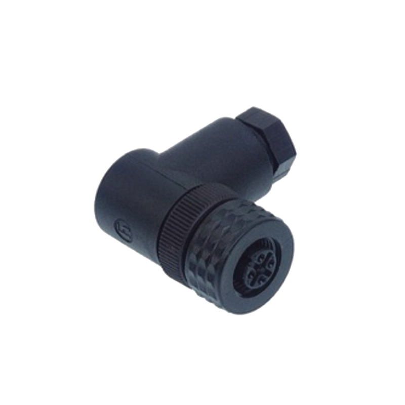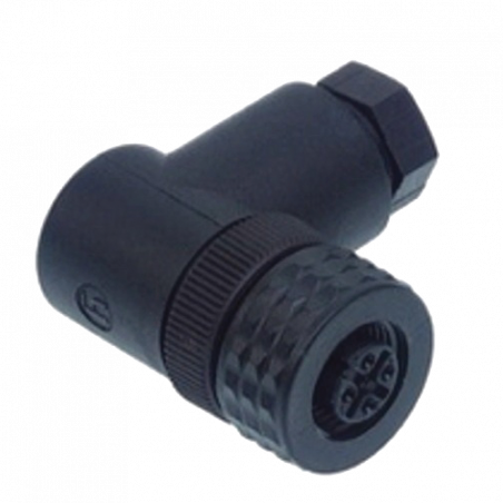 Connecteur femelle M12 (codage K) à 4 pôles coudées avec décharge de traction par pince à cage, 4,0 à 6,0 mm (PG7), convient pour 250V/4A, IP 67, boîtier plastique (PA), -25 à +90 °C.