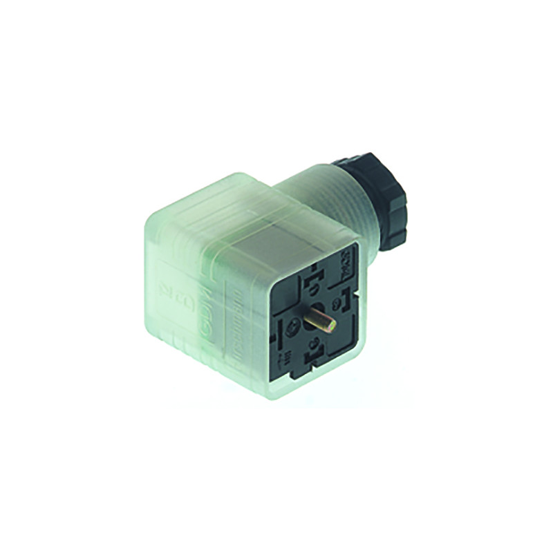 Connecteur de vanne femelle 3+PE coudé noir/transparent de type A avec LED verte et rouge, vis centrale M3x35, 6-9mm/0,25 - 1,5mm² ; PG11, 250 V/8 A, -40 à 90 °C, IP 65. Norme DIN EN 175 301-803-A. Pour les interrupteurs à pression