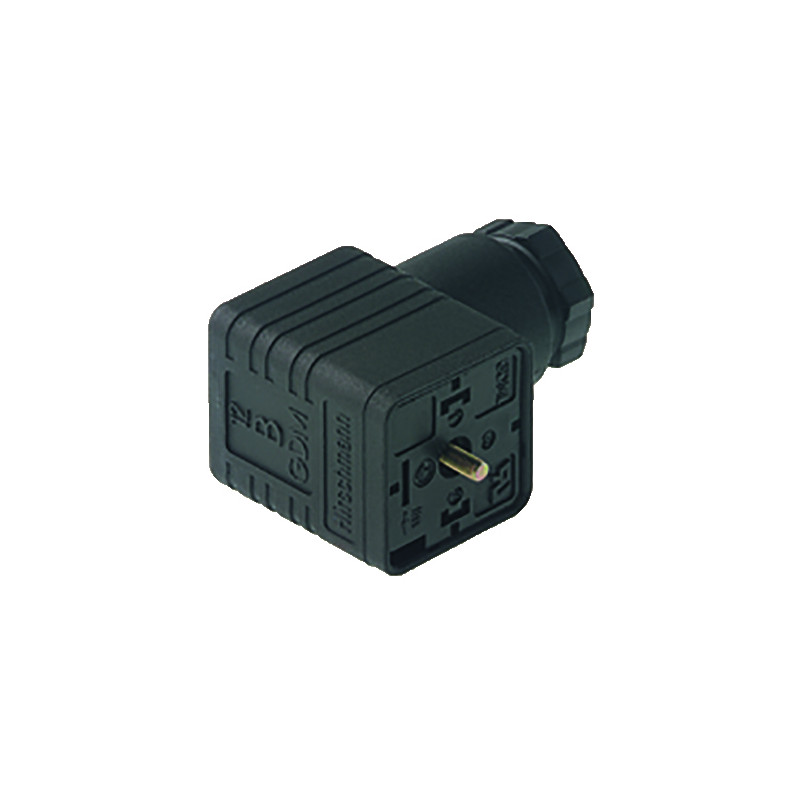 Connecteur de vanne femelle 2+PE coudé noir de type A avec redresseur - diode, vis centrale M3x35, 4,5-10mm/0,25 - 1,5mm² ; M16, 250 V/1 A, -40 à 90 °C, IP 65. Norme DIN EN 175 301-803-A