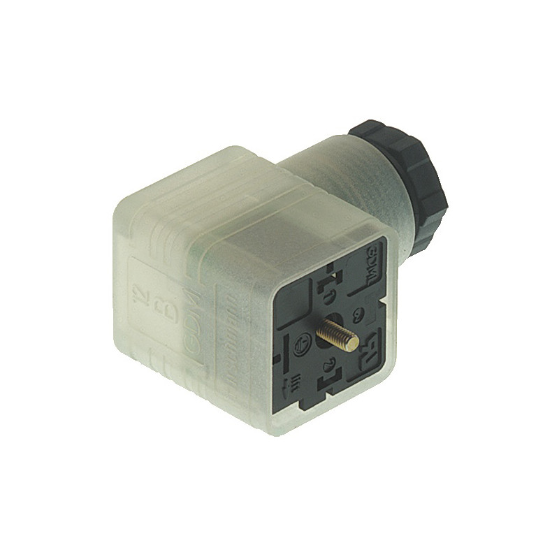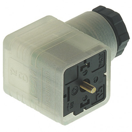 Connecteur de vanne femelle 2+PE coudé noir/transparent de type A avec LED rouge, pont redresseur - varistor, vis centrale M3x35, 4,5-10mm/0,25 - 1,5mm² ; M16, 24 V;1 A DC/2A AC, -40 à 90 °C, IP 65. Norme DIN EN 175 301-803-A
