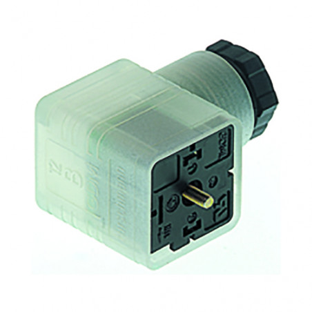 Connecteur de vanne femelle 2+PE coudégris/transparent de type A avec LED et diode rouge, vis centrale M3x35, 4,5-10mm/0,25 - 1,5mm² ; M16, 24 V/8 A, -40 à 90 °C, IP 65. Norme DIN EN 175 301-803-A
