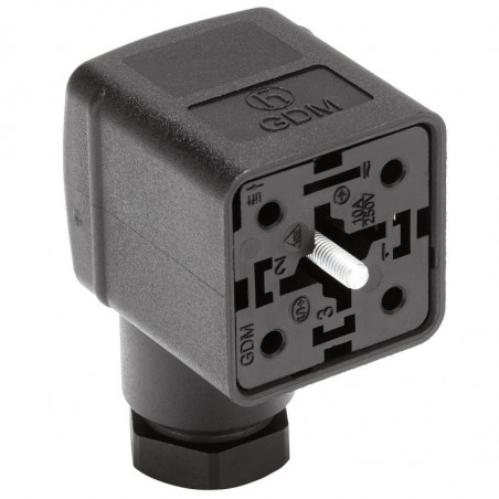 Connecteur de vanne femelle 2+PE coudé noir/transparent de type A, vis centrale M3x35, 4,5-10mm/0,25 - 1,5mm² ; PG9, 230 V/16 A, -40 à 125 °C, IP 65. Norme DIN EN 175 301-803-A