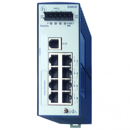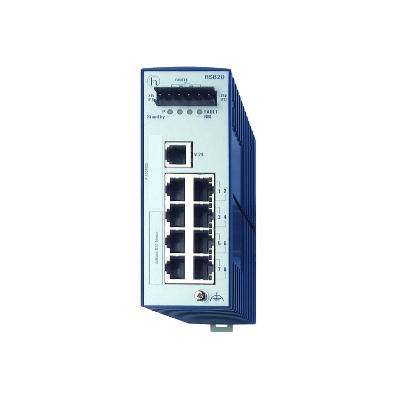 Le RSB20-0800T1T1SAABHH est un switch Ethernet (rapide) avec refroidissement passif (conception sans ventilateur). Ce type a 8x 10/100BASE-TX RJ45, 0-60 °C, est conforme aux normes CE, cUL 508 et ISA12.12.01 C1D2.