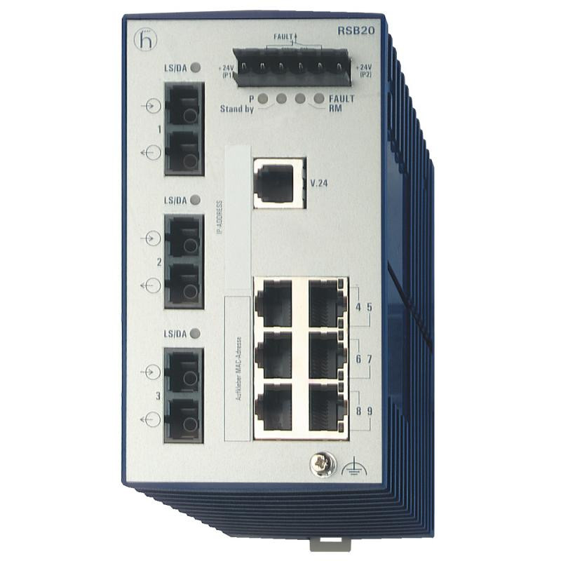 Le RSB20-0900MM2TAABHH est un switch Ethernet (rapide) avec refroidissement passif (conception sans ventilateur).Dispose de 6x 10/100BASE-TX RJ45 - 3x 100BASE-FX multimode SC, -40 à +70 °C, conforme aux normes CE, cUL 508 et ISA12.12.01 C1D2.