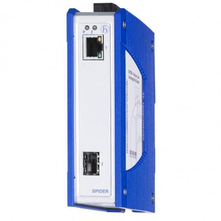 Le switch Spider Unmanaged Rail est un switch Gigabit Ethernet avec refroidissement passif (conception sans ventilateur). Ce type a 1x SFP - 1x 10/100/1000BASE-TX RJ45, et cUL61010 et ISA12.12.01 C1D2 (CE, FCC, EN 61131, EN 60950 sont la norme).
