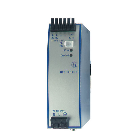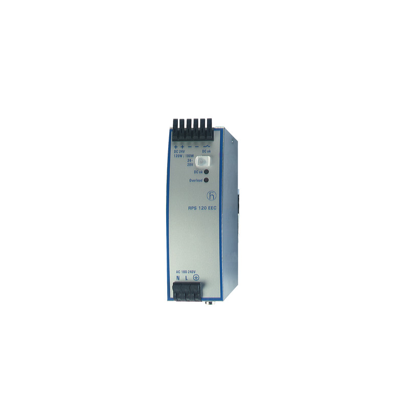 Le RPS 120 EEC (CC) est adapté au montage sur rail DIN (35 mm). Les alimentations électriques peuvent être connectées en parallèle. Connectez-vous à 100-240 V AC (-15%/+10%) ; 50-60Hz ou 110 à 300 V DC (-20%) pour fournir 24-28 V DC. de -25 à +70 °C