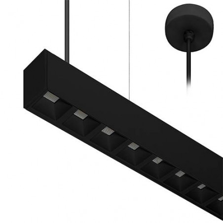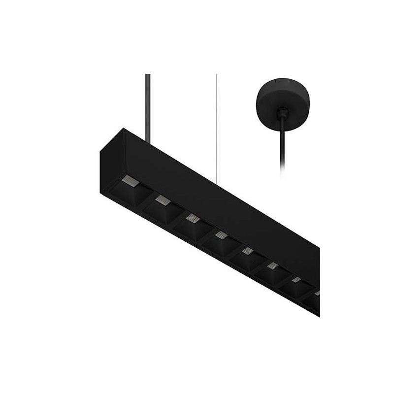 Suspension linéaire.Réflecteur basse luminance.3000K, 3500K ou 4000K à sélectionner.Avec câbles de suspension noirs 2m max.Base ronde et câble dalimentation noirs 2m à commander séparément.Convertisseur non dimmable intégré.