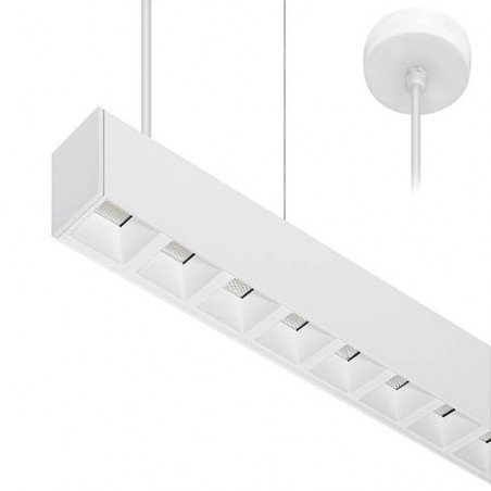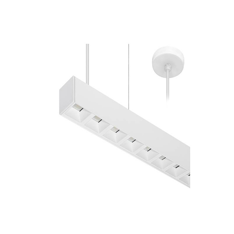 Suspension linéaire.Réflecteur basse luminance.3000K, 3500K ou 4000K à sélectionner.Avec câbles de suspension blancs 2m max.Base ronde et câble dalim blancs 2m à commander séparément.Convertisseur non dimmable intégré.