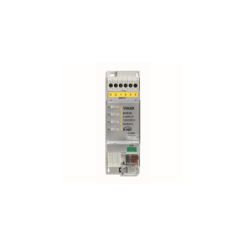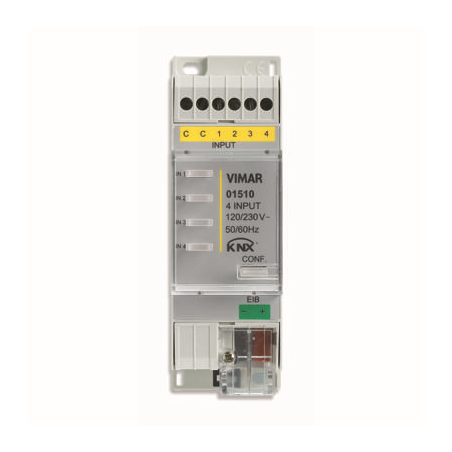 Description: 4 ingangen voor druktoetsen of contactenMax. kabellengte: 30m Ingangsspanning: 120...230VacBeschikbare commandos:On, off, toggle, dimmen en jaloeziesturing met 1 of 2 druktoetsen, versturen van 1-byte waarde, scenario oproepen en opslaan, deurbelfunctie (hold-release), counter met grenswaarde (1, 2 of 4-byte)Status LED per ingang