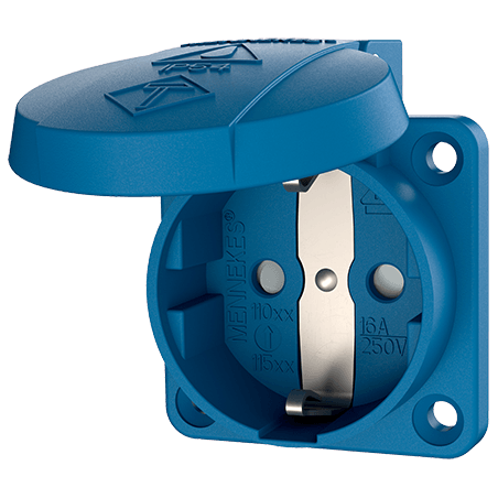 PRISE SCHUKO 16A 2P+PE 230V POUR MONTAGE SUR PANNEAU.DEGRE DE PROTECTION IP54. LE MONTAGE D'UN JOINT EN CAOUTCHOUC EST SUPERFLU.AVEC SECURITE ENFANTS.ENVELOPPE BLEUE AVEC DIMENSIONS DE LA BRIDE 50 X 50 MM ET TROUS DE LA BRIDE 50 X 50 MM. COUVERCLE A CHARN