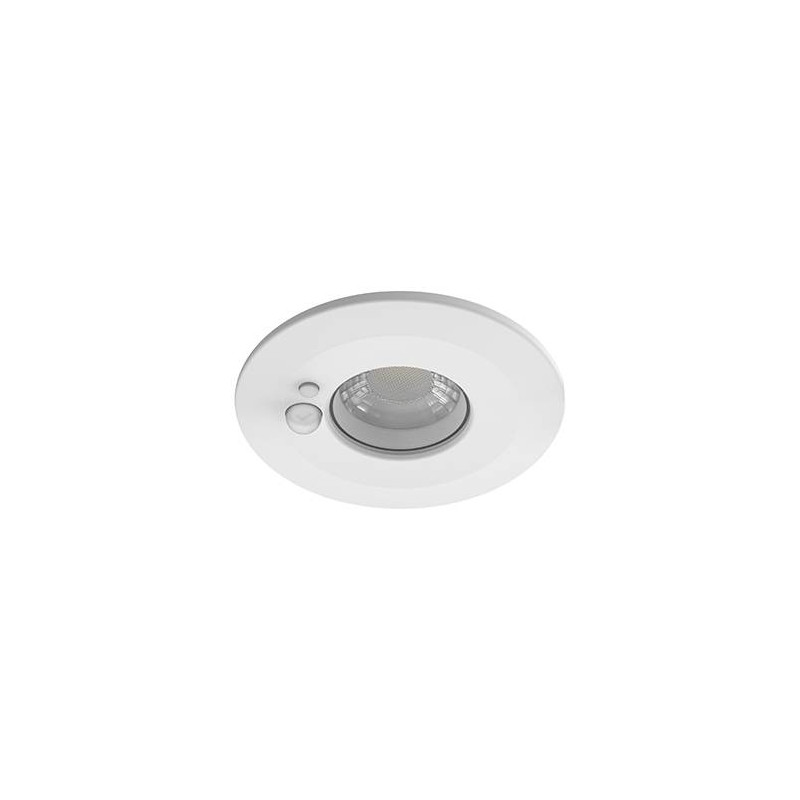 Spot encastré rond fixe 3 en 1.2700K, 3000K ou 4000K au choix dans le luminaire.Fixation par ressorts.Peut être recouvert par un isolant.Avec détecteur IR 90, détection max. 4m de diamètre.Convertisseur non dimmable fourni.